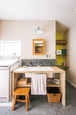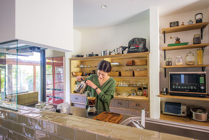 | きれいに使われていたキッチンは再利用し、個性的なタイル張りの壁で囲んだ。水跳ねを防ぎ、手元が上手に隠れる高さが絶妙 | 手持ちの食器棚のサイズに合わせて両側に壁を設け、右側に可動棚を設置。食器棚はガラス戸を外して使い、枠は奥様がアイアン塗装した |