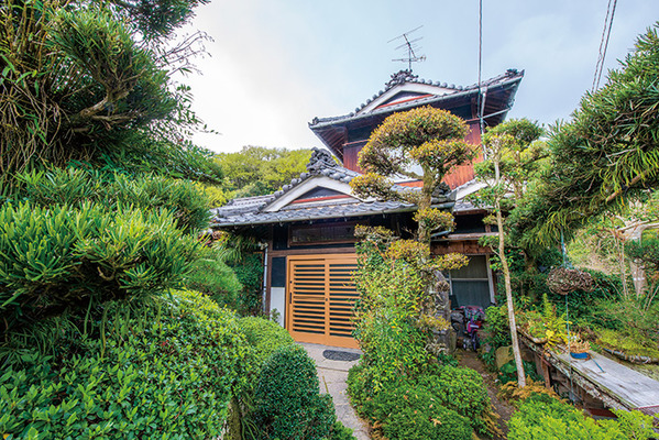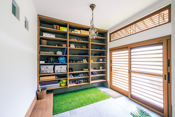 | 庭の緑に囲まれた風格漂うK様邸。外まわりは玄関ドアを変えただけだが、この純和風の佇まいと室内とのギャップの大きさに驚かされる | 大容量の造作収納を備えた広い玄関。スリッパ履きのまま宅急便の受け取りができるよう、玄関タイルの上には人工芝マットが |