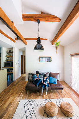 ご主人の実家に隣接するK様邸は、ご夫婦が結婚した約10年前からの住まい。かつてご主人のお祖父様が暮らしていたが、間仕切りの多い昔ながらの家なので、奥様がキッチンで料理をしている間は子どもから目を離さざるを得ない状態をなんとかしたいと考えていた。しかも冬は寒く結露もひどい上に、息子さんがアレルギー体質で、和室の綿壁かハウスダストの影響も疑われていたため、就学を前にリフォームを検討。偶然目にしたマエダハウジングのフリーペーパーに知人のリフォーム事例が掲載されており、本人から満足度の高さを聞いたことがきっかけで同社に施工を依頼することにした。間仕切りの多い家を効果的に間取り変更し、大きい寒暖差の緩和、収納スペースをできるだけ多く確保といった要望をベースにプランを作成。プランの途中で見学会に参加して自然素材の良さを実感し、家族全員の体にも配慮して床は無垢材、壁は漆喰塗りを希望した。また、広縁の建具や梁、もともと持っていたお気に入りの食器棚、そしてお祖父様が遺した大きな古時計や薬箱、ステレオなどを活用することも重視してプランニングを実践。ご夫婦が希望するおおよその間取りを伝えてプランナーが2、3パターンの間取り図を作成し、その中からご夫婦の理想の形へとプランを磨き上げていった。