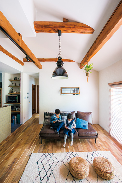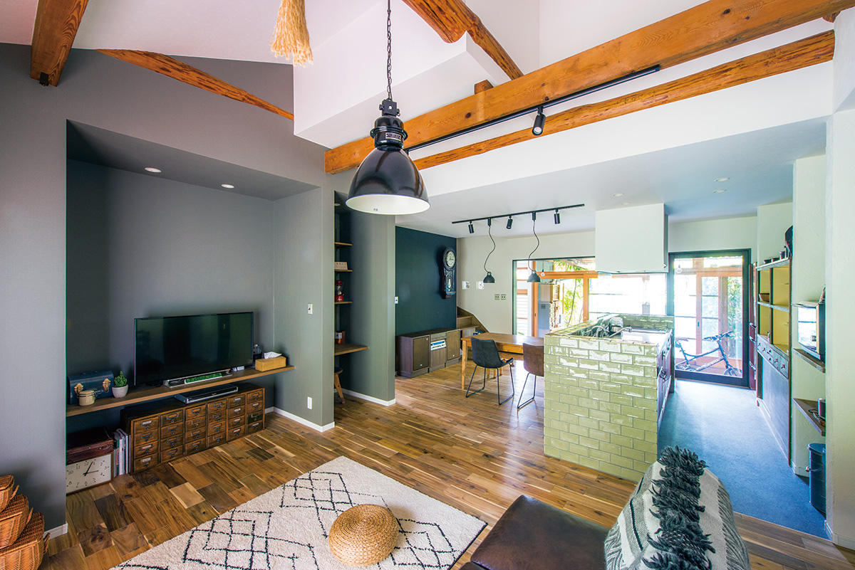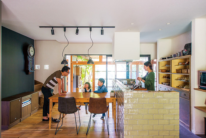 和室2室と廊下部分を入れ替えたLDKは、リビング側の勾配天井が開放感を生み、ダイニング側は既存の建具越しに庭の緑が眺められる癒やしの空間。黒板塗装した壁に古時計と重厚感あるステレオ、テレビ下にはおもちゃや日用品を細かく分けて収納できる薬箱を置き、レトロモダンな雰囲気を漂わせている。独立していたキッチンをLDKに変えキッチンをアイランド型にして再利用したことで、子どもたちの様子をながめながら家事ができることに、奥様は大きな喜びを感じているようだ。花粉症の家族のため、洗面室で洗濯してそのまま室内干しできるようにしたのも家事の効率アップに貢献している。