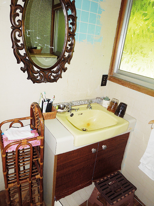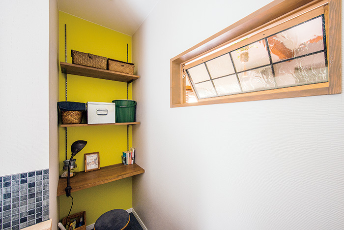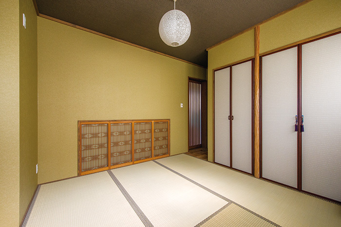 | 洗面室に湿気がこもらないよう、リビングとの間の壁に室内窓を開口して通風を促進。窓は欄間を再利用し、泡入りガラスを入れた | キッチンから変更した和室。壁に和紙風クロスを張り、一部には既存の建具を活用 |