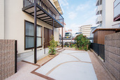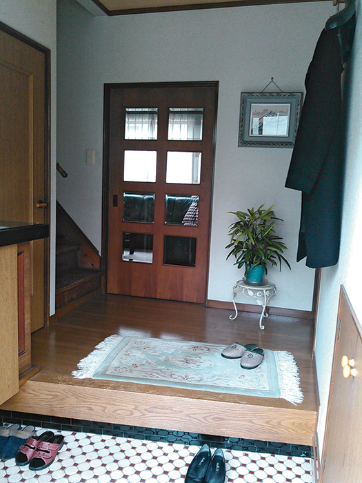 | 庭は植栽を残して駐車スペースにし、広縁をなくしてスロープと手すりを付けた玄関ポーチに。駐車スペースのデザインは娘さんが発案 | 道路からギリギリの位置にあった玄関を庭側に移動し、車からスムーズに出入りできるようになった。広くなった玄関は友人からも好評 |