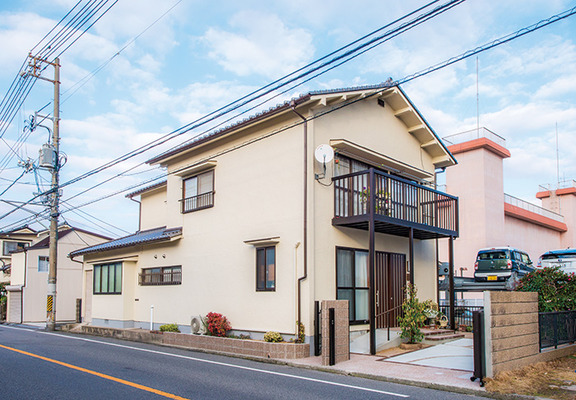 | 将来寝室予定の洋室。壁に設けたニッチの飾り棚は当初プランになかったが、小物を飾るのが好きなK様は「後悔のないリフォームを」と考え、途中で追加 | 路線バスも通る交通量の多い道路に面した側に玄関があり、窓のすぐ近くを歩行者が行き交っていたK様邸。玄関の位置を変更して安全に出入りできるようにし、外壁もきれいに塗装し直した |