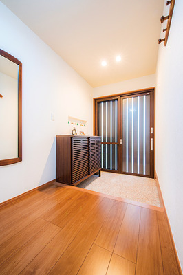 | 将来はベッドが置ける寝室として使うため、和室を洋室に変更。「きれいなので、もったいなくてまだ使っていません(笑)」とK様 | 和室2室の一部ずつを当て、広く確保した玄関。「洗い出しのサンプルのおかげで想像しやすかった」とK様 |