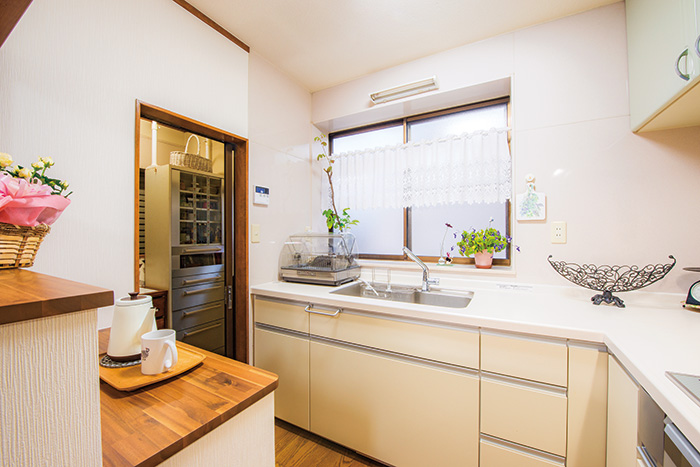 | IHやつり戸を再利用しながらシステムキッチンは一新。つま先で押して水を出せるフットスイッチを備えたTOTOを選択した。キッチン隣にあった自転車置き場はパントリーにし、食器棚収納や荷物の運び入れがしやすい便利な空間に | 6畳から4畳へとコンパクトにした和室。1畳分を仏間とし、垂れ壁はアール仕上げ。床柱には広縁の梁を再利用。立ち退きになったかつての家に使われていて、家族で"御神木"と呼んでいる思い出深いもの |