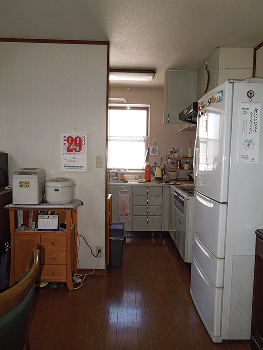 庭を駐車スペースにし、玄関の位置を庭側に移動。玄関を広く確保し、両側の和室2室は1室を寝室として使える洋室に、1室は仏間を備えたコンパクトな和室に。2つあるトイレは、1つを広いトイレにして1つは納戸に変更。キッチンとダイニングの間の壁はくり抜き、つり戸とIHは再利用してシステムキッチンを一新。自転車置き場はパントリーにし、浴室はシステムバスを採用。外壁は塗装し直した。