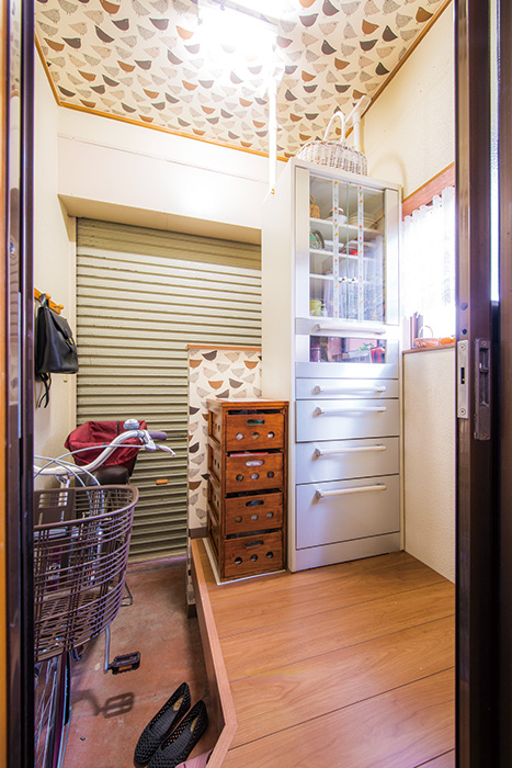 | 資源ごみなどを一時的に保管するにも便利なパントリー。食器棚裏の壁と天井には鳥柄のクロスを採用 |