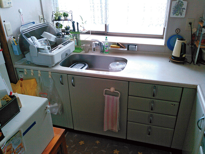 住居兼自転車販売店だったK様邸の店舗部分を住居にリフォームしたのは16年前のこと。その翌年にご主人が亡くなり、現在1人暮らしのK様が再びリフォームを考え始めたのは、大きいひび割れや汚れが目立つ外壁と、駐車スペースの確保がきっかけだった。将来、デイサービスにお世話になるかもしれない場合を想定して、玄関の位置を変更する必要もあった。安佐南区に暮らす娘さんからもらったマエダハウジングの広告を見て、安佐南店の相談会に参加したK様。スタッフの対応が好印象だったことから、担当である府中店で早速プランニングを開始。ご主人の思い出を残しながら、不便の解消や使い勝手の向上を図ることを目指したK様。庭と広縁を駐車スペースに当て、交通量の多い道路に面していた玄関を駐車スペース横に配置。そこから洋室と和室の位置を決め、通風も考慮しながら間取りを決めていった。洗面室とリビング、ダイニングキッチンは元の家の思い出を残すべくほぼ既存としつつ、スタッフの提案でキッチンとダイニングの間の壁をくり抜き、視覚的な開放感とダイニングとの一体感を実現。自転車置き場はパントリーに変え、勝手口から買い物袋を運び込めるようにした。2つあったトイレは1つをなくして納戸にし、雑巾洗いがしやすいシンクの採用も行った。