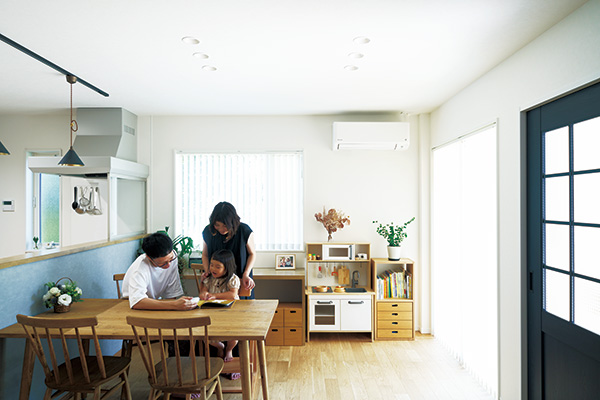 「ダイニングテーブルなどの家具はインスタグラムや雑誌の切り抜きでイメージを伝えて、マエダハウジングのプランナーさんに選んでもらいました。私の好みをよく理解してくれて助かりました」と奥様。家事効率にもこだわり、リビングの横に家族それぞれが個人ロッカーのように仕切って使える、ゆったりとしたウォークインクロゼットを設け、主な衣類はそこに収納。ウォークインクロゼット内に洗面台と物干しを設け、隣の洗濯室やキッチンへと回遊できるようにした。リビングには娘さんのスタディースペースとして造作カウンターを設置し、家族と会話しながらスムーズに家事ができる間取りになった。