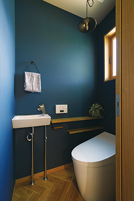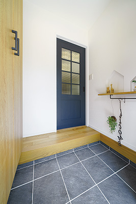 | ご主人がコーディネートしたトイレ。シャープな雰囲気で奥様も気に入っている。 | コンパクトで機能的な玄関。ネイビーのリビング扉と白い壁の色合いが美しい。 |
