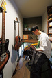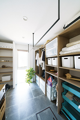 | 寝室の奥に設けたご主人のホビールーム。造作カウンターや本棚を設置し、壁には愛用のギターを掛けたこだわりの空間。 | 1階のウォークインクロゼット。壁際の収納は家族1人ずつ区切り、それぞれ自分のものを収納できるようにした。よく着る服はここに収納し、シーズン違いや特別な機会にしか着ない外出着などは2階の寝室に収納している。WICの連窓を開け、勝手口のドアガラスもスライドさせて開けておくと風が通るため、洗濯物が良く乾く。 |