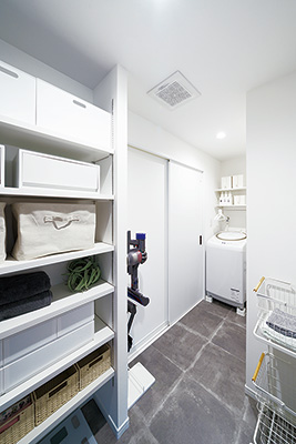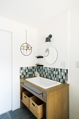 | ウォークインクロゼット内に設けた洗面台。シンクは赤ちゃんの沐浴にも使える医療用の大きいタイプを選択。奥様お気に入りの洗面台は名古屋モザイク工業のタイルを選択。 | 洗濯室には可動棚を設けて下着やタオル類を収納。 |