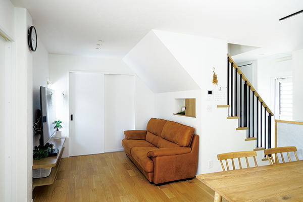 | 明るくナチュラルなリビング。壁一面に大きな窓があったが、大き過ぎて暑さ・寒さが気になったため小さくした。ブラインドを開けると外の緑が絵のように切り取られ、「朝の景色がのどかでほっとします」と奥様。 | 階段下の勾配天井が洞窟のようで落ち着くリビングスペース。ソファ奥の扉は家族の衣類などを収納するウォークインクロゼットに続いている。リビング階段の側面は最初のプランでは壁だったが、抜け感をつくるため手すりに変更。娘さんがアイアン部分をつかんで上がるのにも重宝しているという。 |