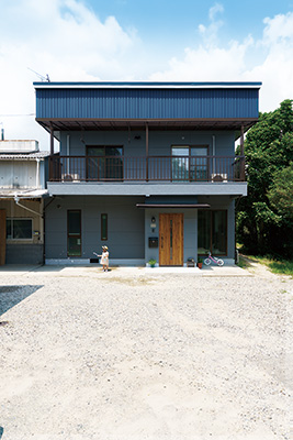 倉庫として使っていた築35年の実家の離れをリフォームするに当たり、親戚から紹介されたマエダハウジングに依頼。奥様の希望は「植物のグリーンが映える、ナチュラルで暮らしやすい家」。最初に屋根をネイビーに決め、同じ色のリビング扉を選び、キッチンには真ちゅうのペンダントライトにマッチするライトグレーのアクセントクロスを用いるなど、クロスの白と木部のライトブラウンを基調にしつつ、好きなものに合わせて全体のデザインを決めていった。