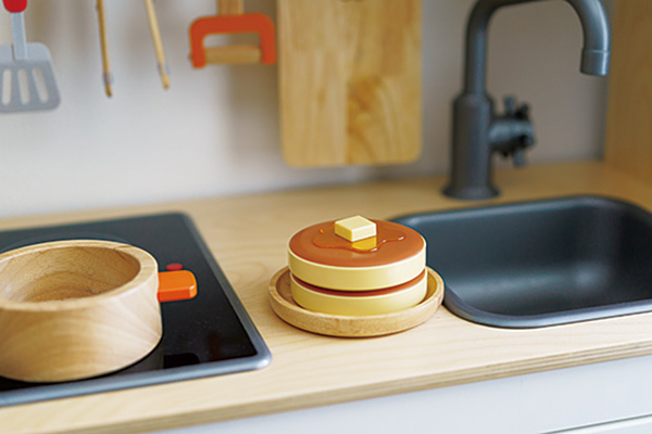| 玄関に設けた家型のニッチ。「下のアイアンの傘掛けは、場所をとらずすっきりして便利です」と奥様。 | リビングに置かれた娘さん愛用のキッチンセット。 |