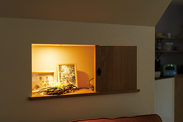 | リビングのソファ上部には写真などを飾る照明付きのニッチを用意。右側はLANなどの配線を隠せるよう扉付きに。 | 雨漏りしていた陸屋根から、メンテナンスも考慮しつつ片流れ屋根にした。 |