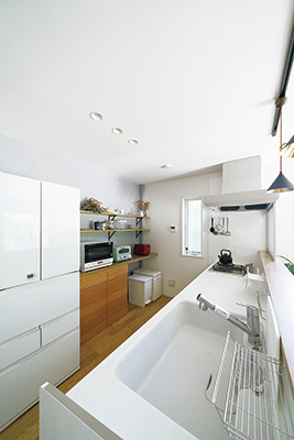 | キッチンはトクラスの中でも最初の希望より予算を抑えた「Bb」に変更したが、思った以上に収納力があり「悩む必要はなかったですね」と奥様。壁側は造作棚の下に無印良品のカップボードを組み合わせた。カップボードの高さに合わせて造作棚を設計したため、ぴったり収まっている。 | 子ども室は空間を無駄なく使えるよう、造作テーブルとオープンタイプのクロゼットを用意。クロゼットは家型にし、壁紙の柄は部屋によって変化をつけた。 |