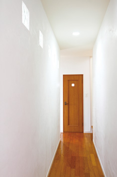 | 玄関から延びる廊下。生徒さんが通る場所なので、漆喰とガラスブロックでナチュラルな雰囲気にセンスUP |