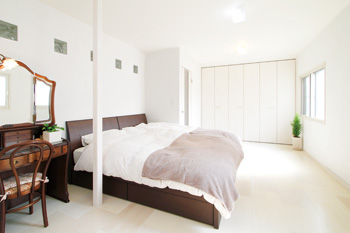 | 元々は狭い和室だった部分を、隣の納戸を取り込み広い寝室に変更。ヨガのレッスン中のご主人の憩いの場に | ダイニングキッチンとリビングを用途によって仕切れるよう、こちらにはスクリーンを設置。レッスンと暮らしを両立する工夫が随所に |