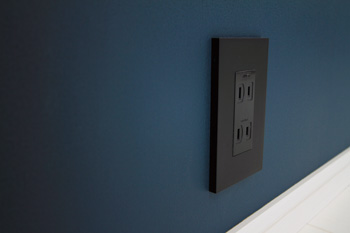 | 個性的なアクセントクロスに馴染むものをと、ご主人がこだわって探したJIMBOの黒色のコンセント | こちらもご主人セレクトの掛け時計。アクセントクロスに白い色が映え、センスの良さを感じさせる |