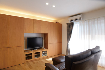 | 壁面いっぱいに大容量の収納家具を造作し、上に間接照明を取り付けたリビングスペース。床はナラの無垢材 |