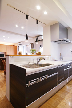 | ナチュラル空間の中にシャープなイメージのペンダントライトでアクセントを加えたキッチン |
