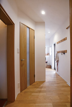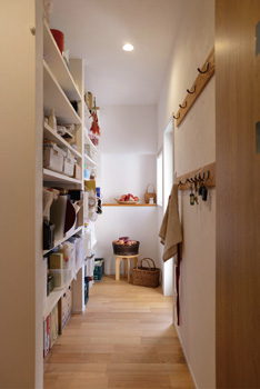 廊下の床もナラの無垢材で温もりを創出。パントリー内は死角になっているため生活感が出にくい |
