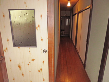 玄関からLDK横に続く廊下。天井と柱は既存のまま活用し、壁はジュラクを用いて美しく。ふすまの向こうはお父様の居室 |