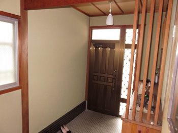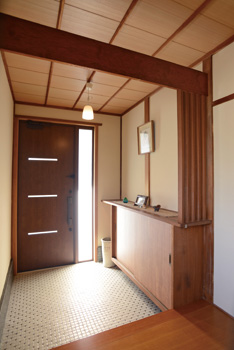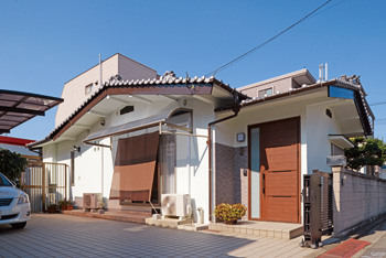 | 壁と玄関ドア、靴箱の扉のみ新しくした玄関。かつての面影をしっかり残した空間になっている | 外観は大きく変えることなく、外壁の塗装をし直して美しい印象に。娘さんの将来にわたって安心できる家になった |
