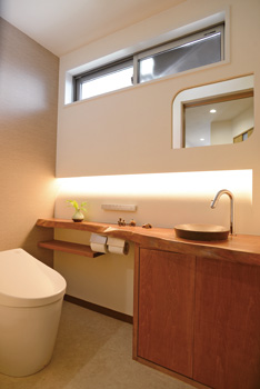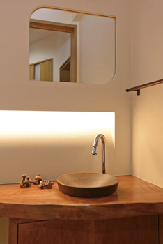 ヒノキの一枚板のカウンターと間接照明が彩るトイレ。間接照明を入れた壁は上へ緩やかにカーブを描き、隠れたアクセントに |