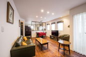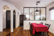 | もともとあった書棚、手持ちのソファや椅子、ローテーブルがゆったりと配置されたリビング。ドアの向こうはご主人の部屋 | ガラスの造作窓のおかげで空間が広く感じられ、レストランのような雰囲気も漂うダイニング。生活感が出やすい冷蔵庫は、手前に食器棚を置いて見えないようにした |