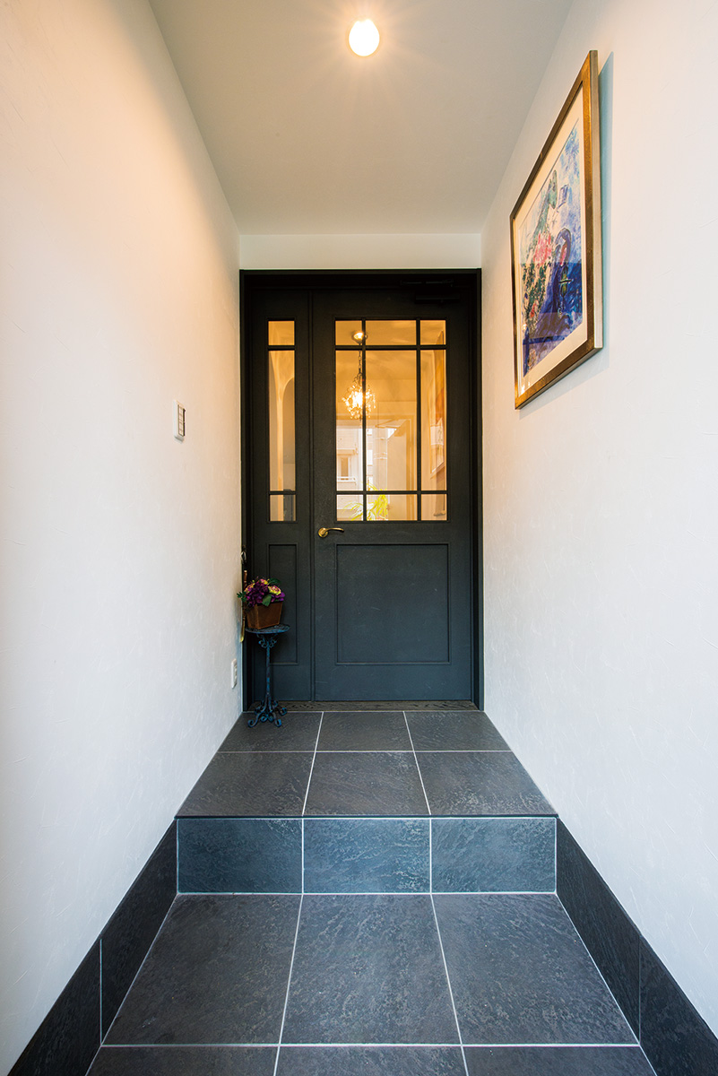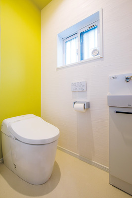 | 以前よりも広くなり、すっきりして見える玄関ホール。アイアン塗装を施した造作ドアと飾られた絵画でシンプルに構成 | 居室とは雰囲気が異なる、爽やかなイエローのアクセントクロスを張って清潔感を漂わせたトイレ。窓は新しく開口した |