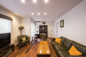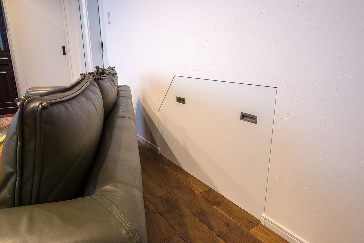 | 幅の広いウォールナットの無垢材の床と手持ちの家具の雰囲気が統一されたリビングダイニング。通風を考慮して3つの開口部を設け、天井を低く感じさせないよう照明はダウンライトを効果的に配置 | ソファの背面には、階段下の空間を有効活用して設けた収納スペース。コーディネーターの提案で造られ、使う頻度の少ない物を収納 |