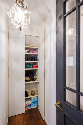 | 床には店舗用のクッションフロアを敷き、天板がステンレス製で使い勝手の良いTOTOのL型キッチンを採用。造作窓には空間を引き締める効果も | 廊下の突き当たりにも階段下収納。コーディネーターの提案で、収納らしく見えないよう取っ手はあえて付けずプッシュ式に |