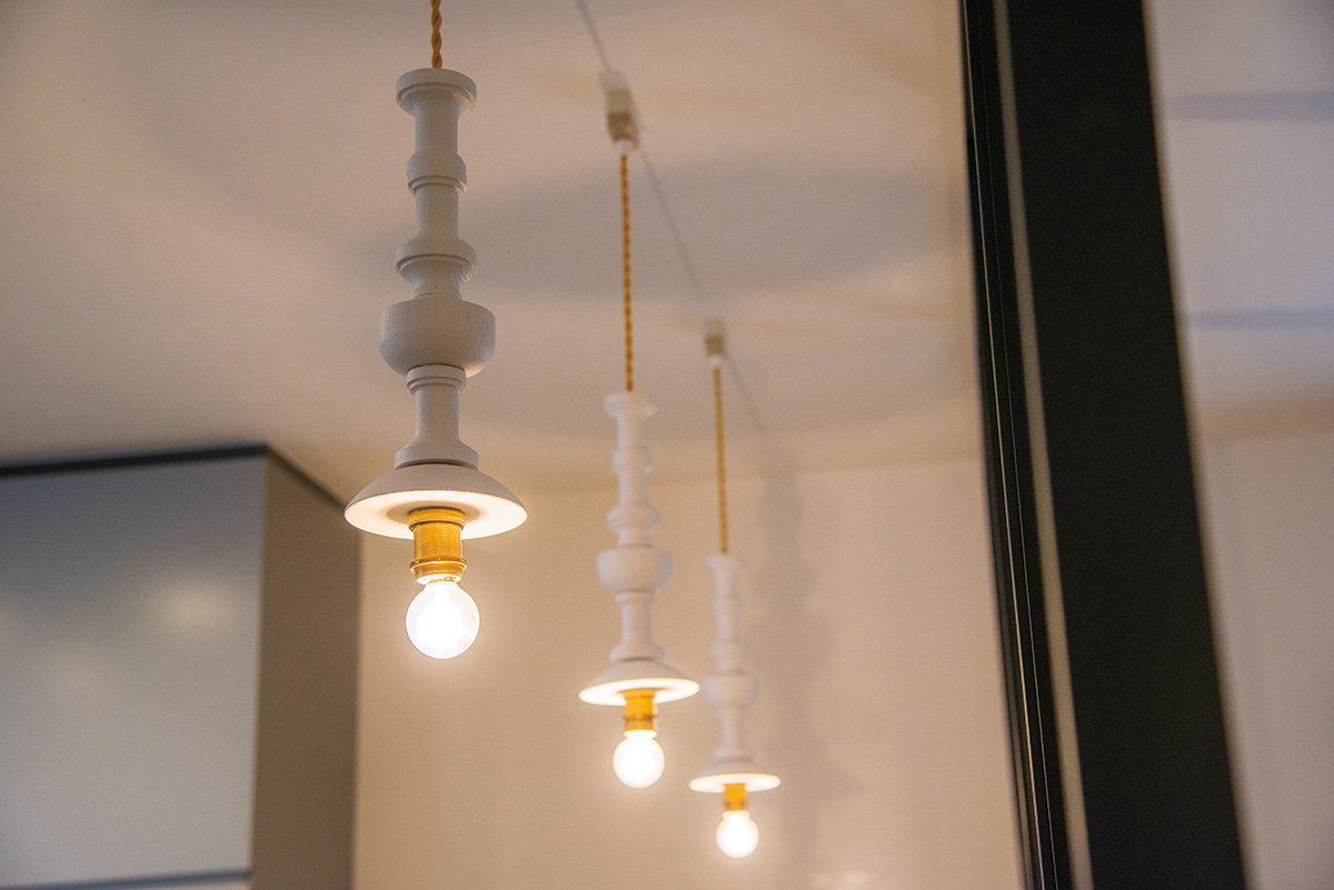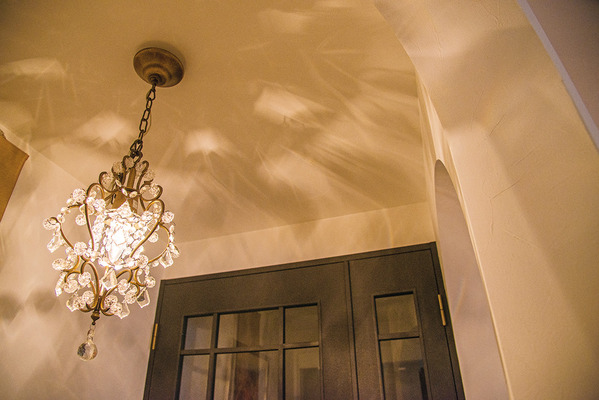 | 天井への映り込みが美しいシャンデリア風の照明は、娘さんが持っていたものを活用 | 奥様が本で見て気に入った木製シェードの照明。コーディネーターが探し出して調達 |