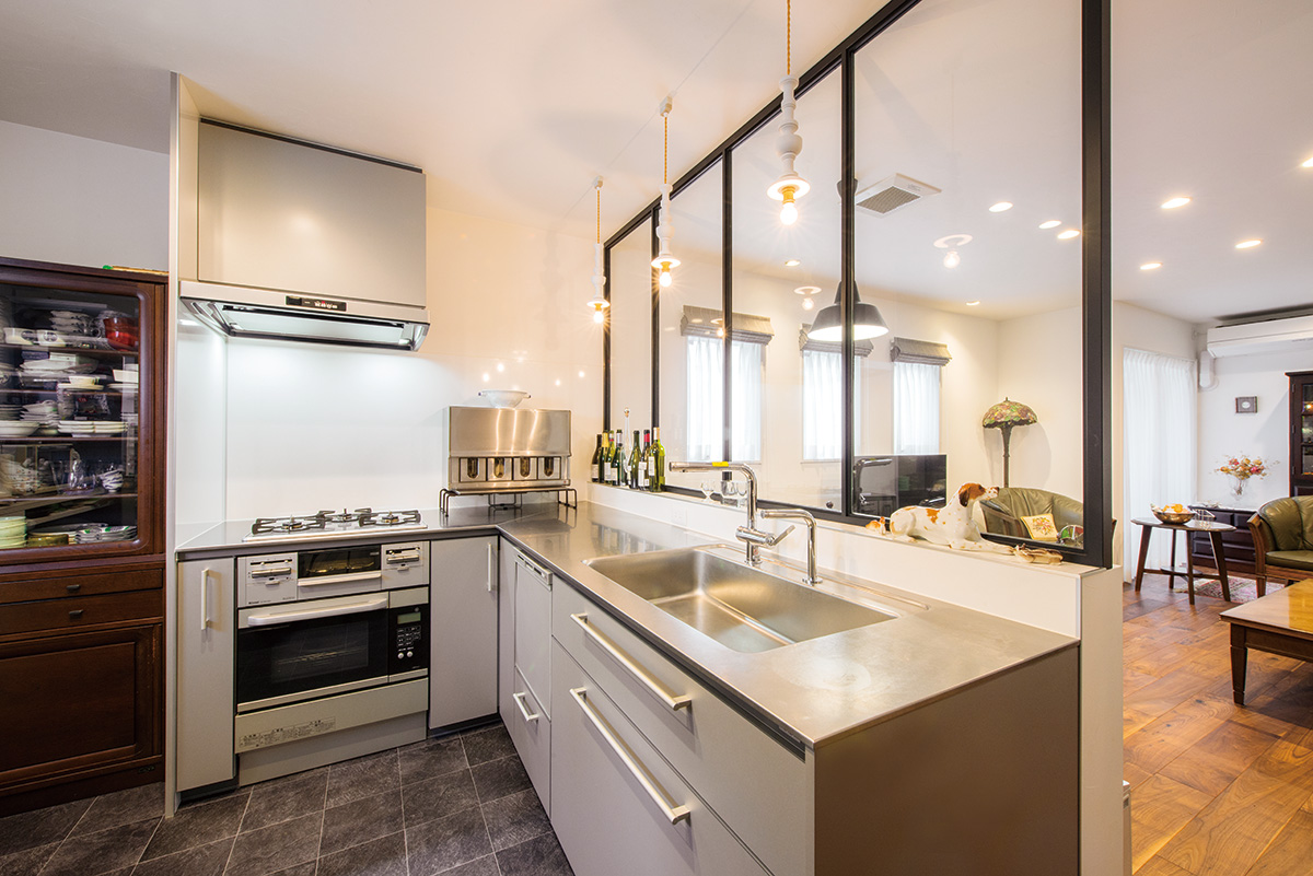 システムキッチンは、奥様がショールームで見てインスピレーションで決めたというL型キッチンを選択。ダイニングとキッチンの間はガラス窓で仕切り、視覚的な開放感を確保しながらも匂いや水跳ねがダイニング側に影響することを避けた。2室を1つの広い空間にしたリビングダイニングは、見た目からも温もりが感じられる無垢材の心地良さが印象的。奥様がリビングで来客中、ご主人が外出するのにリビングを通らなくてもいいよう、サンルームに勝手口を設ける工夫も凝らした。