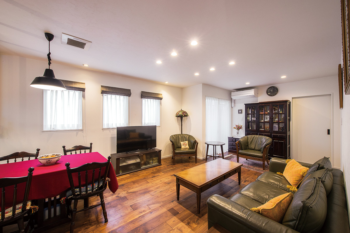 リフォーム後のK様邸は、落ち着いた色合いの無垢材が心地良さを醸し出すリビングダイニングを中心に居心地の良い空間が広がる。間仕切り壁は取り除いたものの、廊下とダイニングの間にある柱は構造上抜けなかった。そのため、「この柱を生かして空間をかっこよく仕上げたい」というコーディネーターの提案により、柱の両側はアール仕上げに。焼き肉などを楽しむときのために、ダイニングの天井には換気扇を設置するという細かい配慮もなされている。