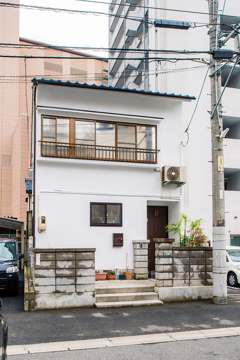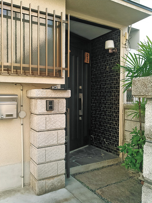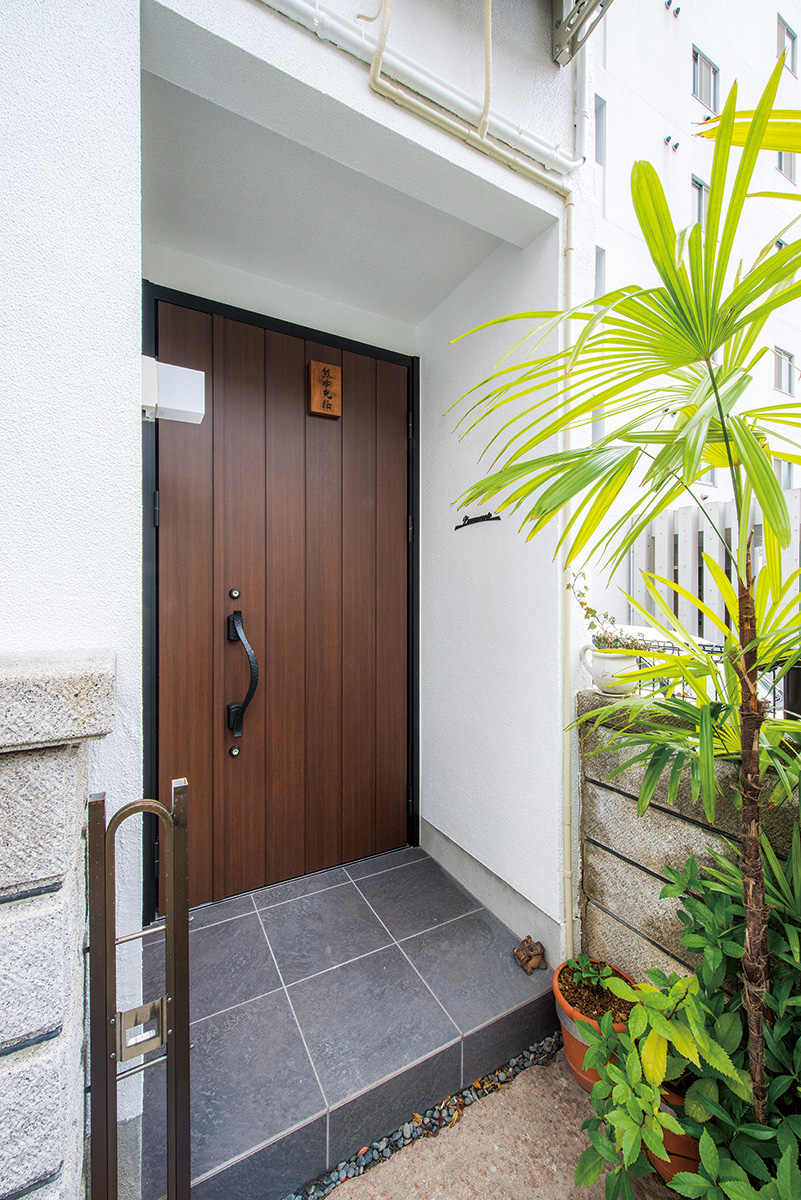 | リビングダイニングの床に使われたウォールナットと同様に、重厚感を感じさせる玄関ドアが印象的なアプローチ | コンクリートブロックの外塀や2階の窓枠などは既存のままとし、外壁のみ白に塗装し直して外観を明るい印象に変えた |