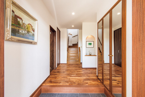内装においても女性コーディネーターの提案が随所に行われ、テレビの上の間接照明や、抜けない柱を利用したデザインウォール、窓に取り付けるシェード選びなど、K様の好みを反映したコーディネートを実践。通風、採光、防犯面を意識し、デザイン性も高めた玄関まわりにも満足しているとのこと。「断熱性が高まってエアコン効率が高いことを実感したので、寒さが厳しい冬をどれくらい快適に過ごせるか楽しみです」と、K様の期待は大きい。
