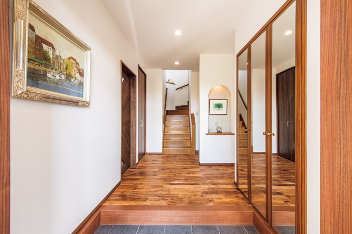 | 収納をなくして視覚的な開放感を生んだリビング。独特のデザインが目を引く無垢の建具を使用。 | 既存のニッチには光沢感ある輸入クロスを張り、全面鏡張りの玄関収納はそのまま生かした。床はLDKと統一。 |