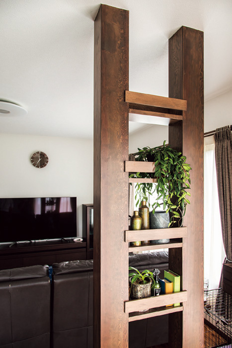 | 通風と採光に優れた玄関ドア。中央の網戸が斜めに開くため屋内はほぼ見えない。 | 取れない2本の鉄骨をうまく活用してデザインウォールとした。 |