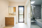 | 浴室の位置を移動し、念願の洗面室を新設。勝手口ができて洗濯物をすぐ外に干せるようになった。 | 建具と土間は生かし大容量のシューズクロゼットを造作した玄関。収納棚の上を間接照明の光が照らす。 |