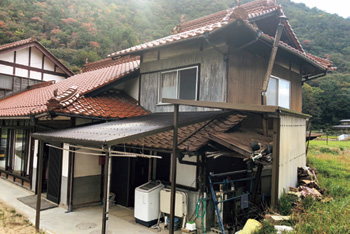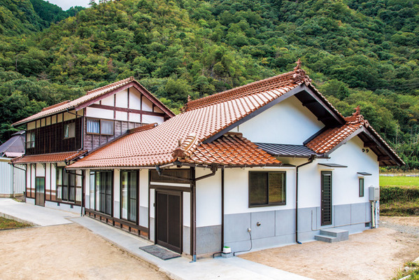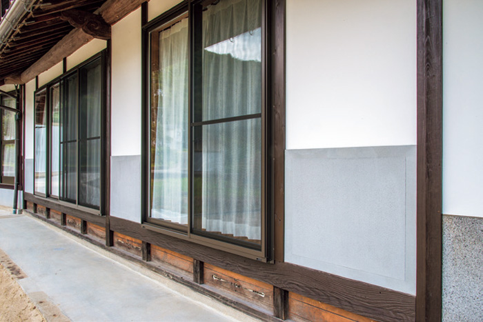 | 縁側のサッシは全て一新。玄関横の壁のモルタル塗りは、単調に見えないよう縁取ったような塗り方に。 | 手前の川に近い側にあった古い家屋を解体して減築。外壁は上を漆喰塗り、腰壁は車が通る際に土が跳ねるため既存部分と同じモルタル塗りに。 |