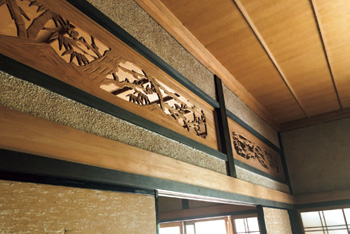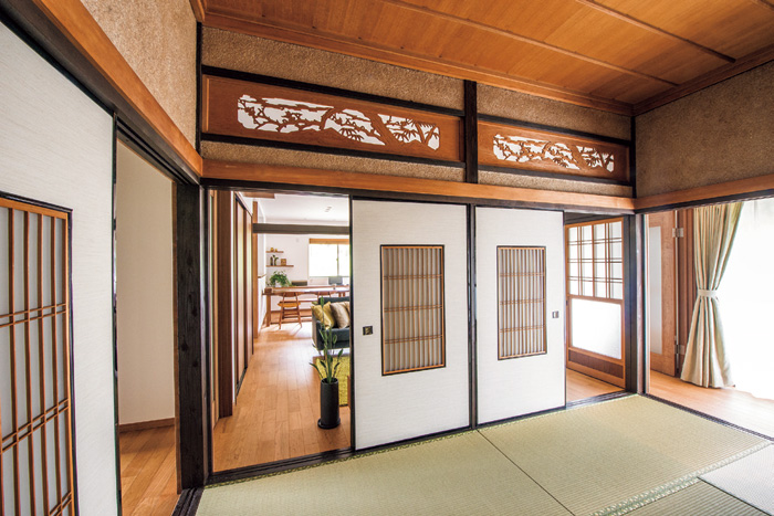 | 和室2室をつないで誕生した広いリビングダイニングは既存部分とうまく融合。柱と梁を残して垂れ壁をなくし、梁の上には間接照明を設置した。 | 既存の欄間はそのまま再利用。リビング側にはアクリル板を入れることで、和の雰囲気が出過ぎないよう工夫。 |