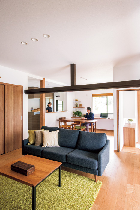 暮らしやすい間取り変更や段差の解消で生まれ変わったLDKは、天井が高く開放感が増幅。以前は暗かったが、白を基調とした明るい空間に一変した。プランニングの段階では、減築することで屋内が狭くなるのではと不安を感じていたお母様だったが、完成してみるとまったく狭小感がなく、K様一家に適した広さであることを実感できたという。また、K様の要望で質の良い木材が使われていた梁や柱、欄間などをうまく再利用できたことも満足度を高めた。「和室には家の思い出を色濃く残し、LDKは既存部分を上手に残しつつ新しい空間をつくり上げてもらい、それぞれ違う雰囲気が感じられるのもうれしいです」とK様。断熱性と耐震性を高め、段差を解消し、浸水の被害を受けたため床下の防蟻処理も万全に行ったK様邸。家族全員が安心して快適に暮らせるようになったことが、何より大きな喜びに違いない。