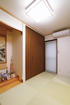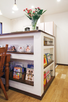 | キッチンカウンター側面には、コーディネーターの提案と職人の技でカーテンレールを活用したブックシェルフが | 仏間と床の間、クロゼットを確保した和室。 室内干しもでき、現在は奥様と子どもたちの寝室として利用している |