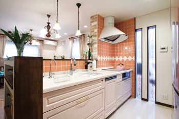 | キッチン内側の壁面にはタイル、リビング側にはレンガを貼ったキッチン。 スリット窓を設けて光を取り込み、明るさも十分 |