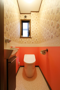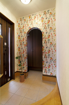 | 上がり口の床や玄関収納前の壁をアールにし、壁面には花柄のクロスを貼るなどして優しい印象に仕上げた玄関。壁の足元にはレンガをあしらっている。ベビーカーを中に置いても壁が目隠しになってくれるため、玄関を常にスッキリと保てる | トイレは設備を一新し、手洗いカウンターを新設。腰壁部分のクロスは外壁と同系色に |