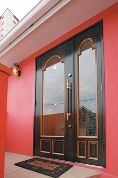 | 将来的にレジカウンターとなる予定の白い什器の横には、小上がりの和室を設けた。奥の扉が住居スペースとの出入り口 | 玄関ドアは奥様のイメージを基にデザインし、造作してもらったもの。「イメージ通りの仕上がりで大満足です」と奥様 |