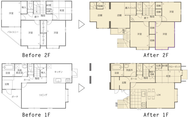 1階は独立していたキッチンをリビングに取り込んでLDKにし、キッチンのあった部屋は和室に変更。浴室、洗面脱衣室、トイレは一新し、玄関には大容量の玄関収納を新設した。2階は和室を洋室に変更し、トイレを一新。廊下に手洗い台を設置。完全分離した店舗スペースは増築で広くし、外階段から直接入れる設計に。